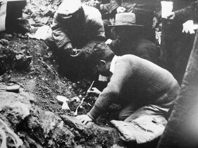 贾兰坡马上命人用绳子把现场围了起来,自己趴在地上亲手挖掘。慢慢地,耳骨、眉骨也从土中露出来了。直到中午,这个头盖骨的所有碎片才被全部挖出。贾兰坡将头盖骨送回办公室,清理、烘干、修复,把碎片一点一点对粘起来。
