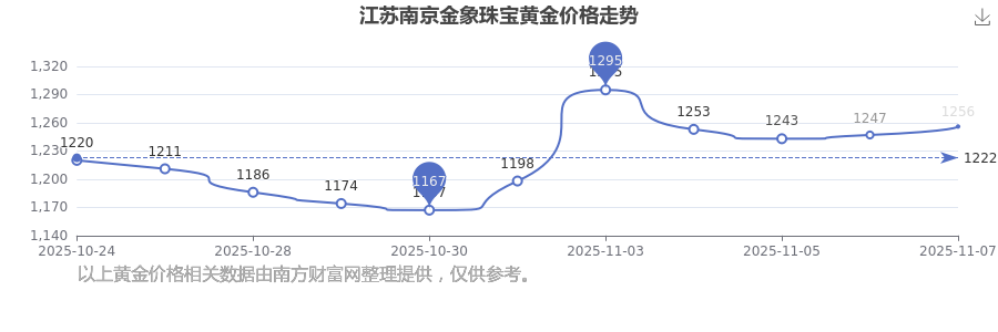 江苏南京金象珠宝的金价在今日(2025年11月8日),每克售价为1256.0元/克。